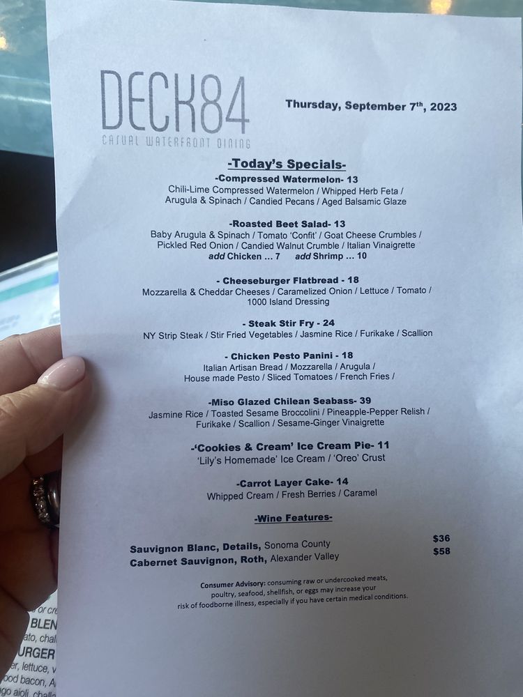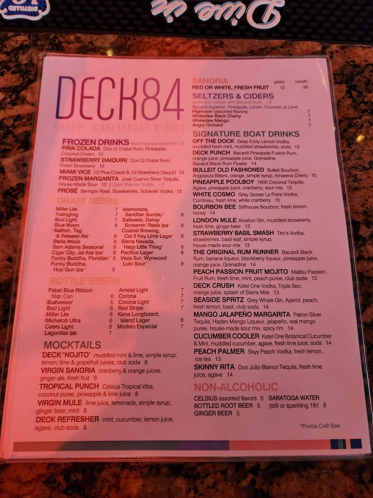 Deck 84, located in Delray Beach, FL, offers a diverse menu of New American cuisine, sushi, and seafood. With a range of amenities like outdoor seating, happy hour specials, and a full bar, Deck 84 caters to a variety of preferences. Customer reviews praise the beautiful decor, attentive service, and delicious dishes like the mushroom flatbread, Smashburger, and butter cake. The scenic view of the water adds to the dining experience, making it a great spot for both locals and visitors. The extensive brunch menu, including options like Chef Jon's French toast and smoked salmon scramble, provides something for everyone. Whether you're looking for a casual meal or a special dining experience, Deck 84 has something to offer.